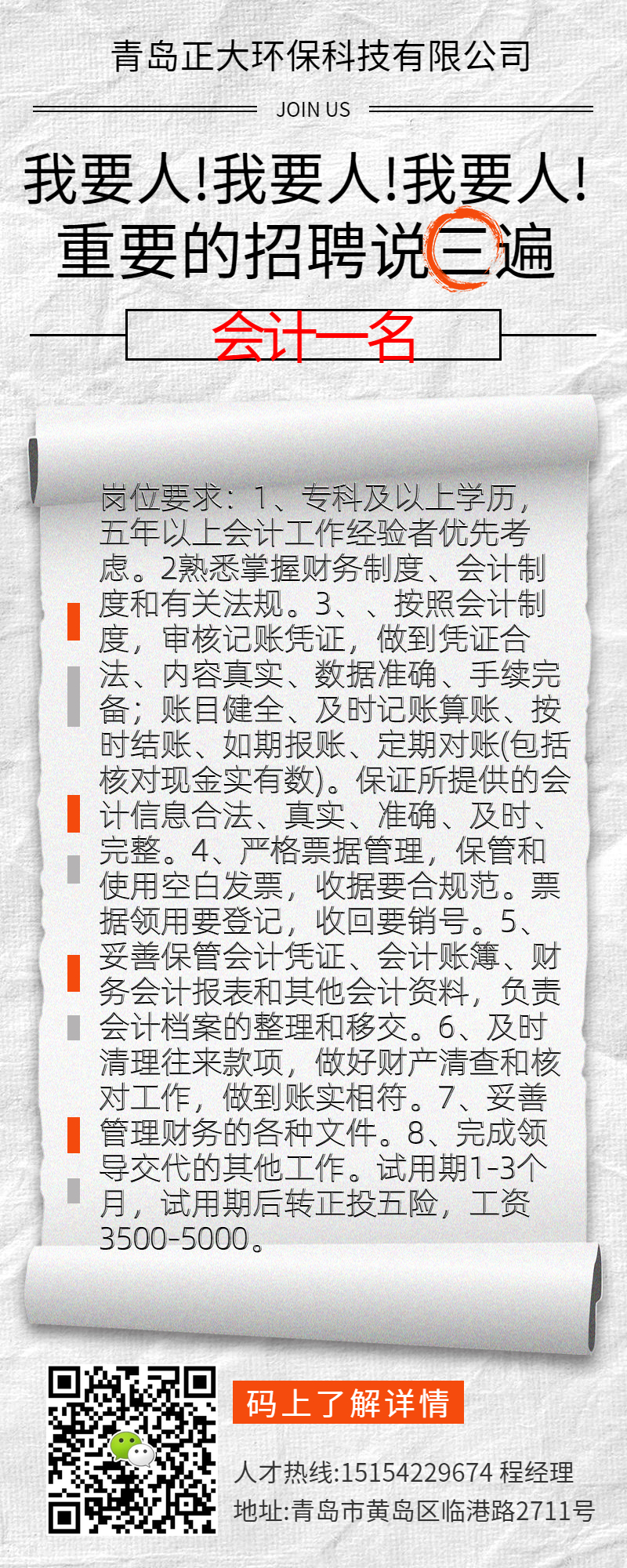 青島正大環(huán)??萍加邢薰菊衅笗?jì)一名待遇從優(yōu),